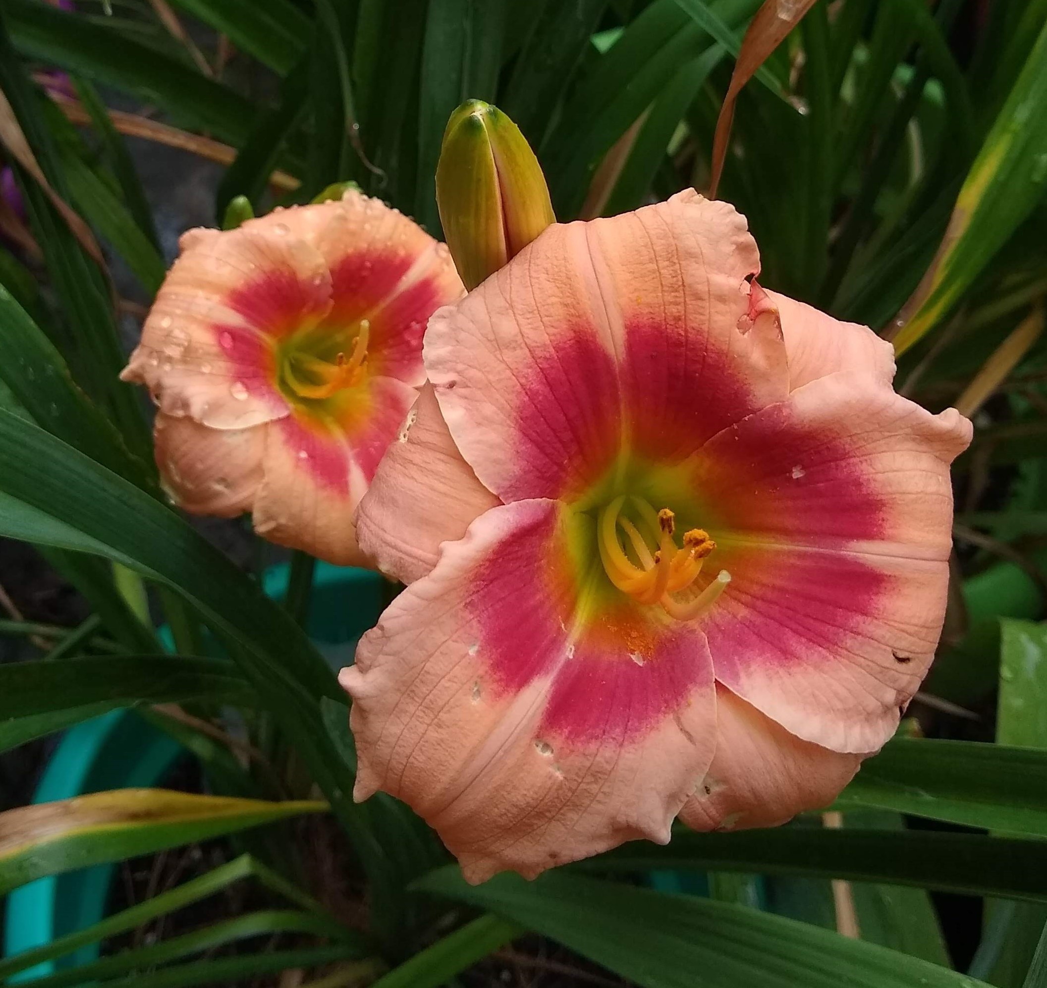 Beautiful recurved daylily, salmon pink color with a green throat and a raspberry pink eye.